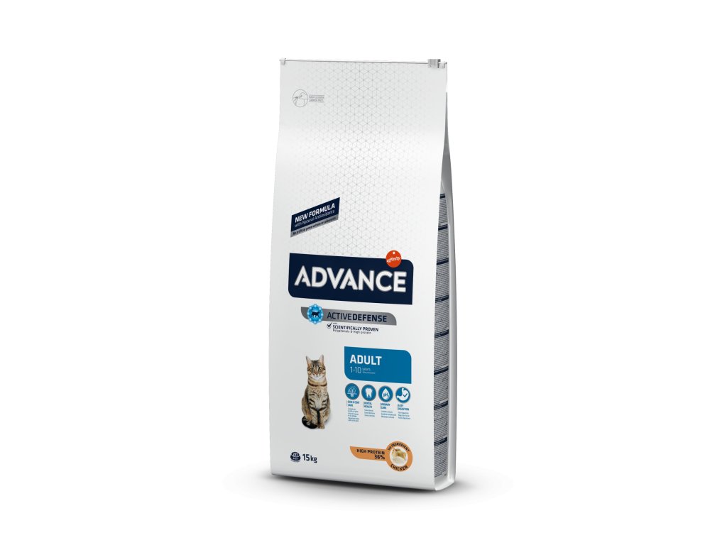 ADVANCE CAT Adult kuře a rýžeSuperprémiové krmivo speciálně navrženo pro dospělé kočky s vysokým obsahem kuřecího masa 21 %. Obsahuje omega-3 a omega-6 mastné kyseliny a vitaminy, které přispívají ke zdravé kůži a lesklé srsti. Speciální minerální látky – pyrofosforečnany pomáhají předcházet tvorbě zubního plaku a podporují svěží dech. Kombinace minerálních látek a specifických složek udržuje optimální pH moči. Kuře a rýže jsou přísady, které lze snadno strávit, s obsahem imunoglobulinů, které přispívají ke střevnímu zdraví. Jakmile vaše kočka dosáhne dospělého věku, její nutriční potřeby se změní a potřebuje krmivo, které pomáhá udržovat ideální tělesnou kondici. Krmivo Advance Adult je špičkové a snadno stravitelné, splňuje specifické potřeby vaší kočky a posiluje její přirozené bariéry a obranyschopnost.
