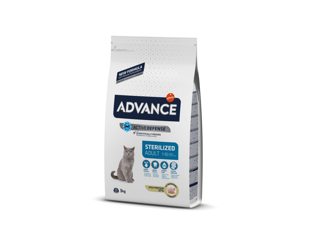 ADVANCE CAT SterilizedMáte-li doma kastrovanou nebo sterilizovanou kočku je třeba její výživě věnovat speciální pozornost. Pomocí specifického krmiva Advance přizpůsobeného právě potřebám koček po kastraci, udržíte kočce nejen ideální hmotnost, ale i zdravé močové cesty, protože udrží optimální hodnoty pH v moči, a podpoříte správné trávení. Vláknina a L-karnitin snižují počet kalorií v krmivu a pomáhají metabolizovat tuky. Granule navíc obsahují i speciální minerály (pyrofosforečnany), které pomáhají předcházet tvorbě zubního plaku a podporují svěží dech. Díky své receptuře a pečlivě vybraným ingrediencím Advance také přispívá ke zdraví střev a pomáhá přirozené obranyschopnosti. ADVANCE Sterilised Adult je speciálně doporučován pro kastrované kočky od 1 roku.