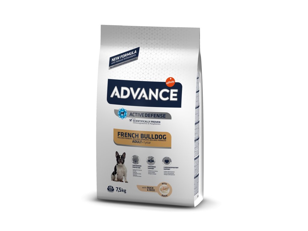 ADVANCE DOG French BulldogSuperprémiové suché krmivo Advance Dog pro dospělé francouzské buldočky. Bílkovinou složkou je kachní maso. Omega-3 a omega-6 mastné kyseliny, kolagen, biotin i zinek pomáhají udržovat ochranu kožní bariéry. Kolagen a kvasnice pomáhají udržovat funkci chrupavky a vertebrálních nervů. Obsahuje složky na podporu kardiorespirační funkce. Kvasnice, jablko a řepa přispívají k optimálnímu trávení s méně pachy.