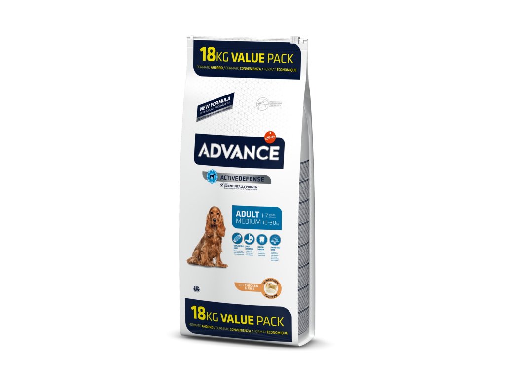 ADVANCE DOG MEDIUM AdultKompletní krmivo pro středně velká plemena psů s lehce stravitelnými proteiny a sacharidy. Obsah kuřecího masa a rýže zajišťuje vysokou stravitelnost a krmivo je tak vhodné především pro psy s citlivým trávením. Imunoglobuliny obsažené v krmivu napomáhají přirozené obranyschopnosti vašeho psa. Obsah pyrofosfátů pomáhá odstraňovat zubní plak a kámen. Omega-3 a omega-6 mastné kyseliny napomáhají k lesklé a zdravé srsti a kůži.