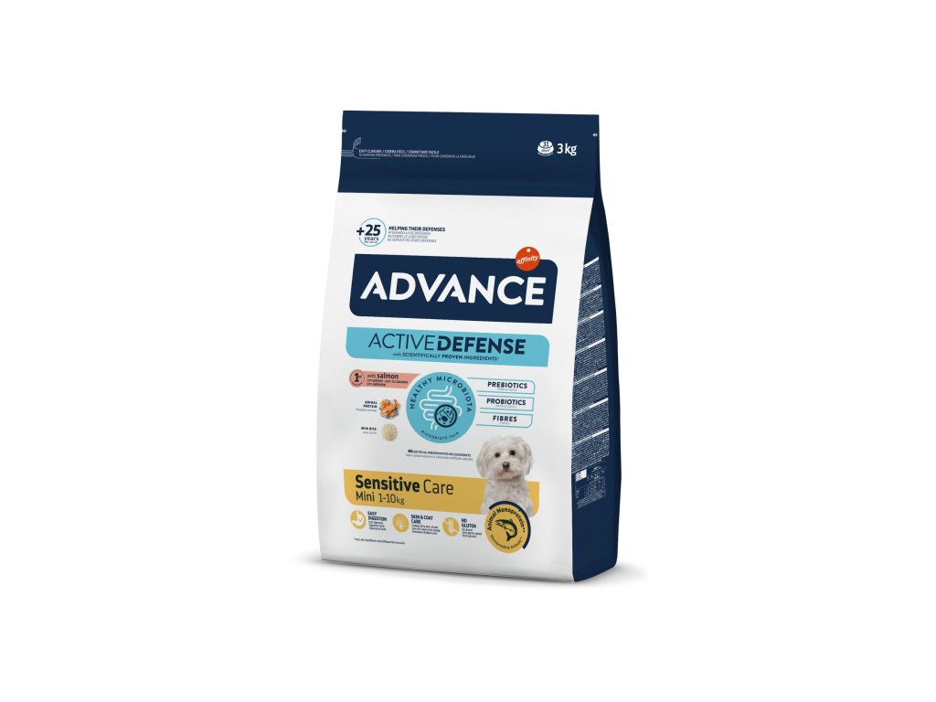 ADVANCE DOG MINI SensitiveU malého psa s citlivým zažíváním je třeba k výživě přistupovat obezřetně. Pokud má tedy váš pes citlivé zažívání, jeho žaludku může ulevit superprémiové krmivo Advance, které bylo připraveno na míru dospělým psům malých plemen s citlivým zažíváním. Monoproteinové krmivo z lososa jako jediného zdroje živočišných bílkovin spolu s rýží a obsahem inulinu podporuje zdravé trávení a snadno se tráví. Díky omega mastným kyselinám, biotinu a zinku navíc zlepšuje stav kůže a srsti.