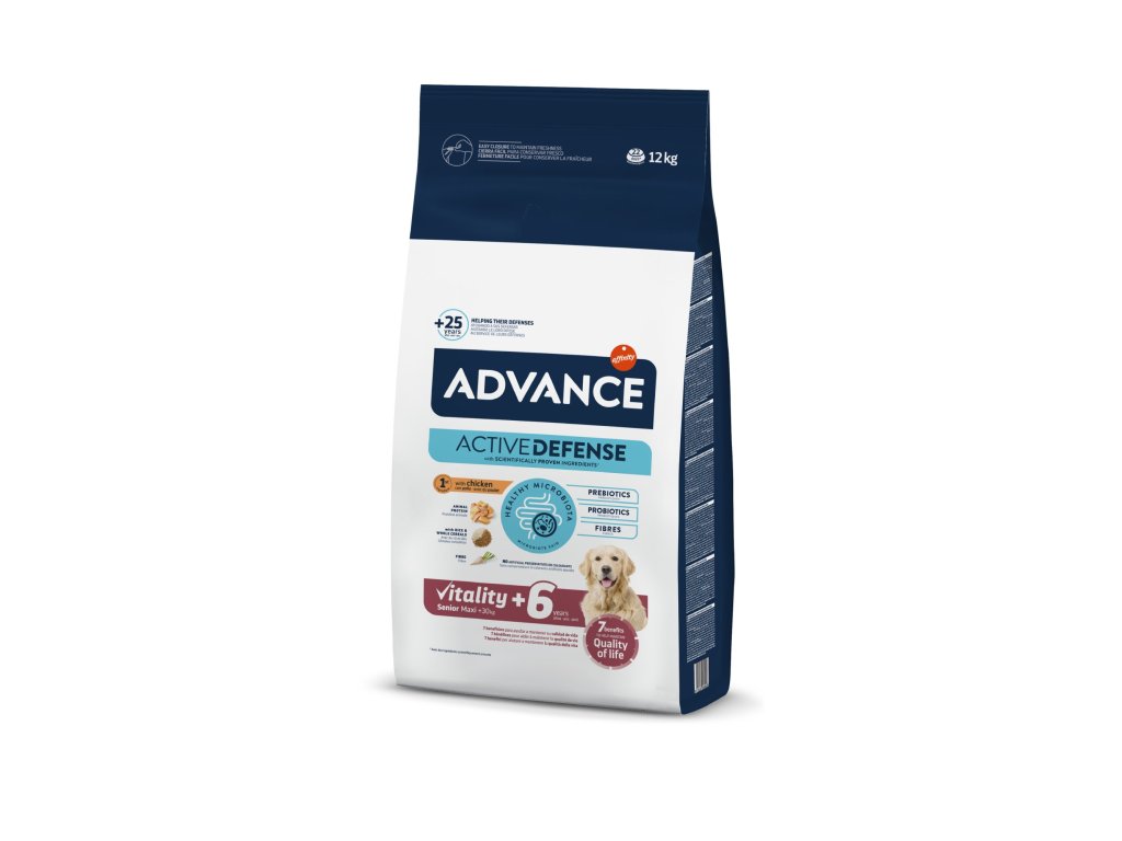 Advance Vitality Senior Maxi +6 pomáhá udržovat vitalitu velkých psů starších 6 let. Poskytuje jim 7 klíčových benefitů přizpůsobených jejich věku, které pomáhají udržet kvalitu jejich života. Krmivo je lehce stravitelné a granule jsou přizpůsobeny velikosti velkých psů.Doplňkové parametry