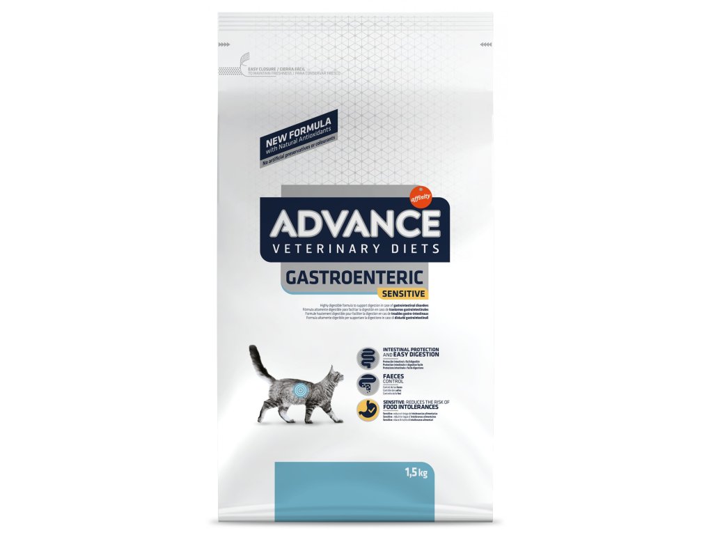 ADVANCE-VETERINARY DIETS Cat Gastro Sensitive 1,5 kgKompletní dietní krmivo pro koťata od 8 týdnů a dospělé kočky, které pomáhá kompenzovat trávicí dysfunkce v případě gastrointestinálních poruch a exokrinní nedostatečnosti pankreatu. Riziko nežádoucích účinků snižuje receptura, která je založená na vybraných zdrojích bílkovin a sacharidů, vysoce stravitelných přísadách, středním obsahem tuku a zvýšeným obsahem sodíku a draslíku. Obsahuje také prebiotika (FOS), která napomáhají rozvoji střevní mikrobioty, a sepiolit, který pomáhá zlepšit konzistenci stolice.