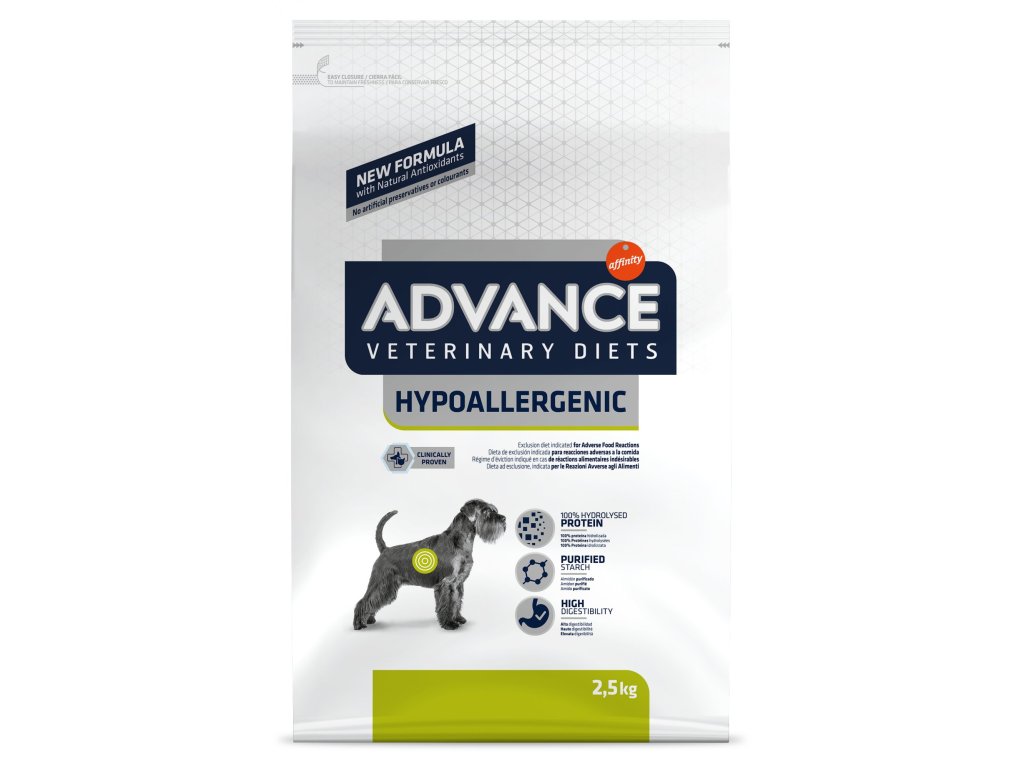 ADVANCE-VETERINARY DIETS Dog HypoallergenicKompletní dietní krmivo pro štěňata a dospělé psy, doporučený ke snížení nesnášenlivosti na přísady a živiny v potravě. Obsahuje jediný zdroj bílkovin a jediný zdroj uhlohydrátů. Formulovaný s hydrolyzovaným sójovým proteinem s velmi nízkou molekulovou hmotností jako jediným zdrojem bílkovin a čištěným škrobem jako jediným zdrojem uhlohydrátů. Navíc díky svému hypoalergennímu potahu má vynikající chuť.