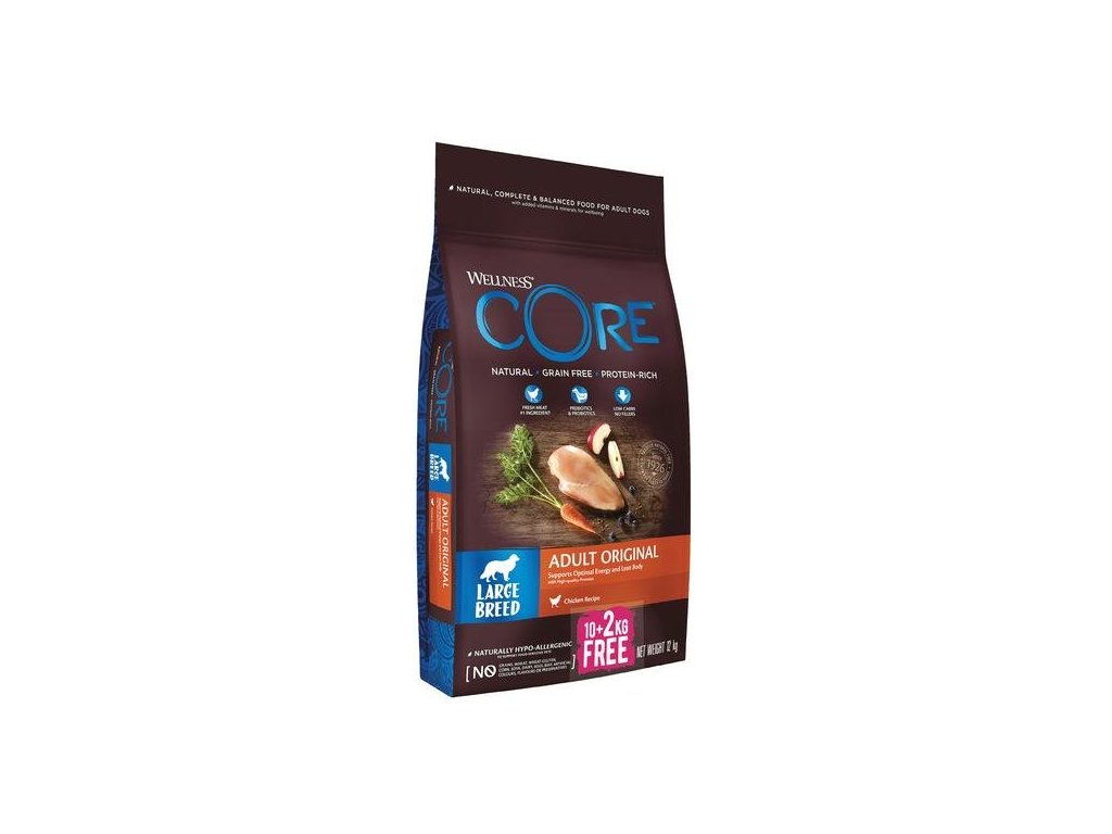 Wellness Core Dog LB Adult Original kuře 10 + 2 kgSkvělý zdroj živočišných bílkovin pro velká plemena aktivních psů. Granule Wellness Core Dog LB Adult s kuřetem jsou plné kvalitního masa a také vybrané zeleniny, ovoce a vitamínů. Díky vysokému obsahu proteinu doplňují potřebnou energii a udržují tak vašeho psa aktivního i na dlouhých procházkách. Samozřejmostí je složení bez obilovin a umělých přísad.