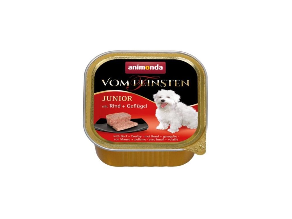 Animonda Vom Feinsten Junior paštika pro psy hovězí a drůbežíAnimonda Vom Feinsten Junior paštika je lahodné a chutné krmivo speciálně uzpůsobené potřebám štěňat od 5 týdne věku a mladým rostoucím psům především malých ras. Jedná se o špičkovou kvalitu z vybraných druhů masa, která potěší každého pejska.