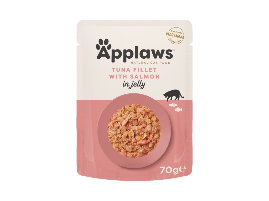 Nový vzhled, stejná kvalita! Kapsička pro kočky plná tuňákových filetů s masem z lososa v lahodném želé. Vláčné a šťavnaté, pro nejvybíravější kočky! Doplňkové krmivo pro dospělé kočky z čistě přírodních surovin. Skrz průhledný „talířek“ vidíte, co kupujete!Jelly kapsičky vynikají svou lahodností a vláčnou konzistencí masa, které je zjemněné rostlinou želírující látkou. Jelly kapsičky obsahují min. 60% masa, základem je zjemněné maso z kuřecích prsou nebo z tuňáka v celých kouscích, dle receptury jsou doplněny chuťově atraktivním masíčkem, např. jehněčím, kachním, makrelou, lososem apod. Applaws vyniká svou kvalitou a složením. Neobsahuje žádná dochucovadla, konzervační látky, barviva ani uměle přidané vitamíny. To nejlepší, co můžete dát své kočce!