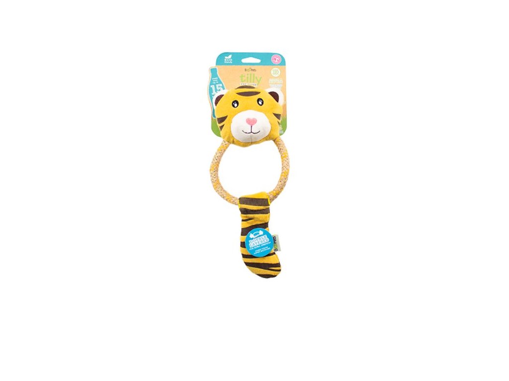 Hračka pro psy z řady Dual material - tygřice Tilly je vyrobena z recyklovaných plastových lahví a má interaktivní, recyklovatelné pískátko. Její tvrdý trup z konopného a bavlněného lana, dvojité prošití a dvouvrstvé provedení dávají tušit, že je 100 % připravena na zápas s Vaším domácím mazlíčkem.