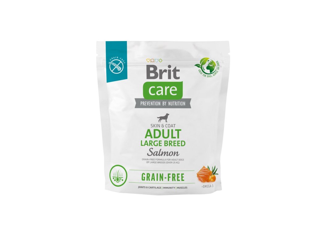 Brit Care Dog Grain-free Adult Large Breed, 1 kgSuperprémiové kompletní krmivo pro psy velkých plemen, jehož receptura je zcela bez obilovin. Obohaceno o živiny a minerální složky, které podporují správnou funkci imunitního systému. Krmivo je s obsahem chondroprotektiv, které zajišťují správný vývoj kostí, kloubů a chrupavek. Obohaceno také o probiotika pro správnou funkci imunitního systému.