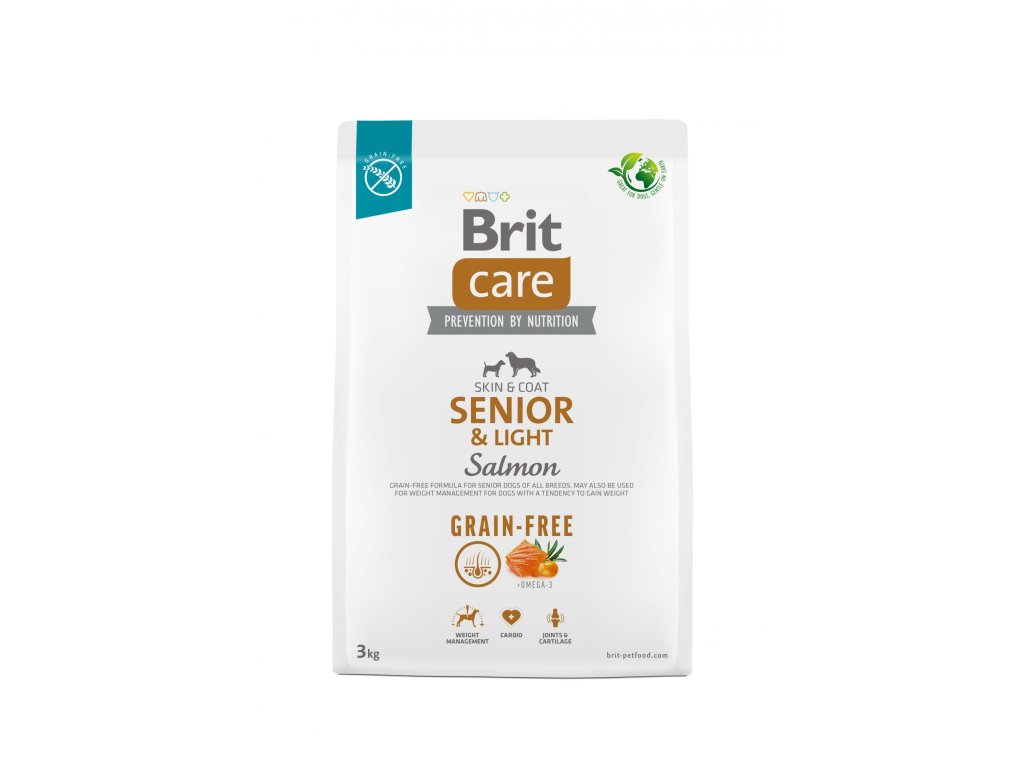 Brit Care Dog Grain-free Senior and Light, 3 kgSuperpremiové kompletní krmivo pro starší psy všech plemen, jehož receptura je zcela bez obilovin. Obohaceno o živiny a minerální složky, které podporují správnou funkci imunitního systému. Krmivo je s obsahem vlákniny, která zajišťuje kontrolu hmotnosti stárnoucích psů. Obohaceno také o probiotika pro správnou funkci imunitního systému a chondroprotektiva pro správný vývoj kostí, kloubů a chrupavek.