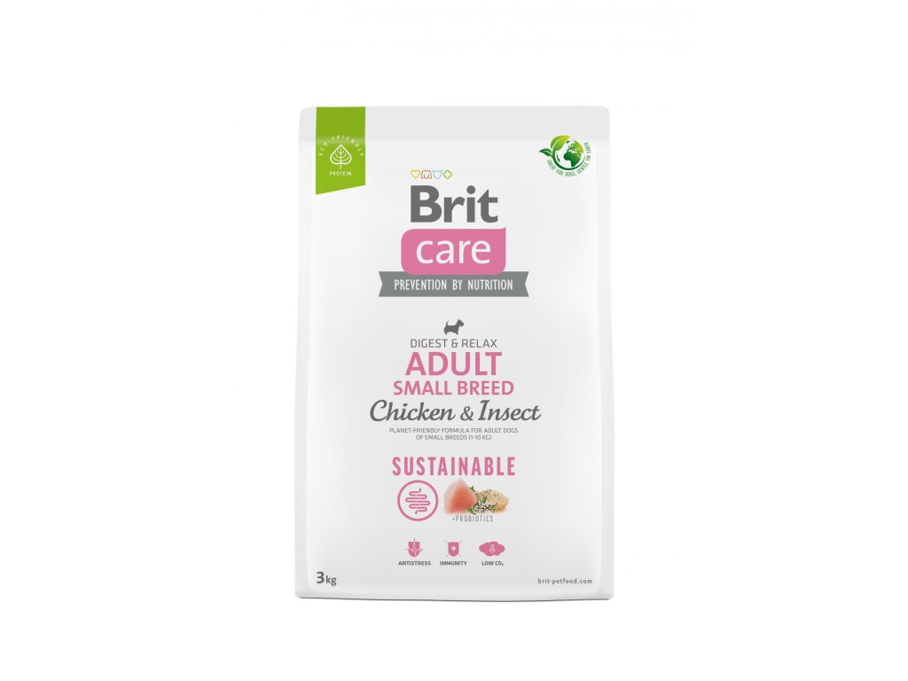 Brit Care Dog Sustainable Adult Small Breed, 3kgDobré pro vašeho psa i pro životní prostředí: Brit Care Sustainable Adult Small Breed Chicken & Insect je vyvážené kompletní krmivo speciálně pro psy malých plemen, které se vyznačuje udržitelnou výrobou. Hmyz slouží mimo jiné jako zdroj bílkovin, který lze chovat obzvláště šetrně k životnímu prostředí a který boduje svou dobrou snášenlivostí.