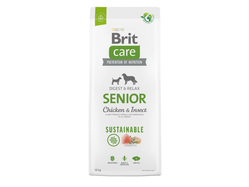 Brit Care Dog Sustainable Senior, 12 kgKrmivo je vyvinuto s ohledem na denní potřebu starých psů všech plemen. Obsahuje látky podporující zdravé trávení, zlepšení kondice a podporu imunity. Krmivo neobsahuje lepek, je vhodné i pro jedince se sklonem k obezitě. Obohaceno o chondroprotektiva, které podporují funkci kostí a kloubů. Receptura je vyrobena z ekologických proteinů a udržitelných surovin.