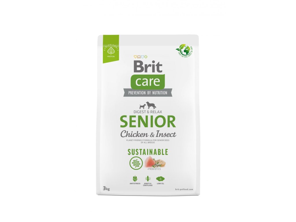 Brit Care Dog Sustainable Senior, 3 kgKrmivo je vyvinuto s ohledem na denní potřebu starých psů všech plemen. Obsahuje látky podporující zdravé trávení, zlepšení kondice a podporu imunity. Krmivo neobsahuje lepek, je vhodné i pro jedince se sklonem k obezitě. Obohaceno o chondroprotektiva, které podporují funkci kostí a kloubů. Receptura je vyrobena z ekologických proteinů a udržitelných surovin.
