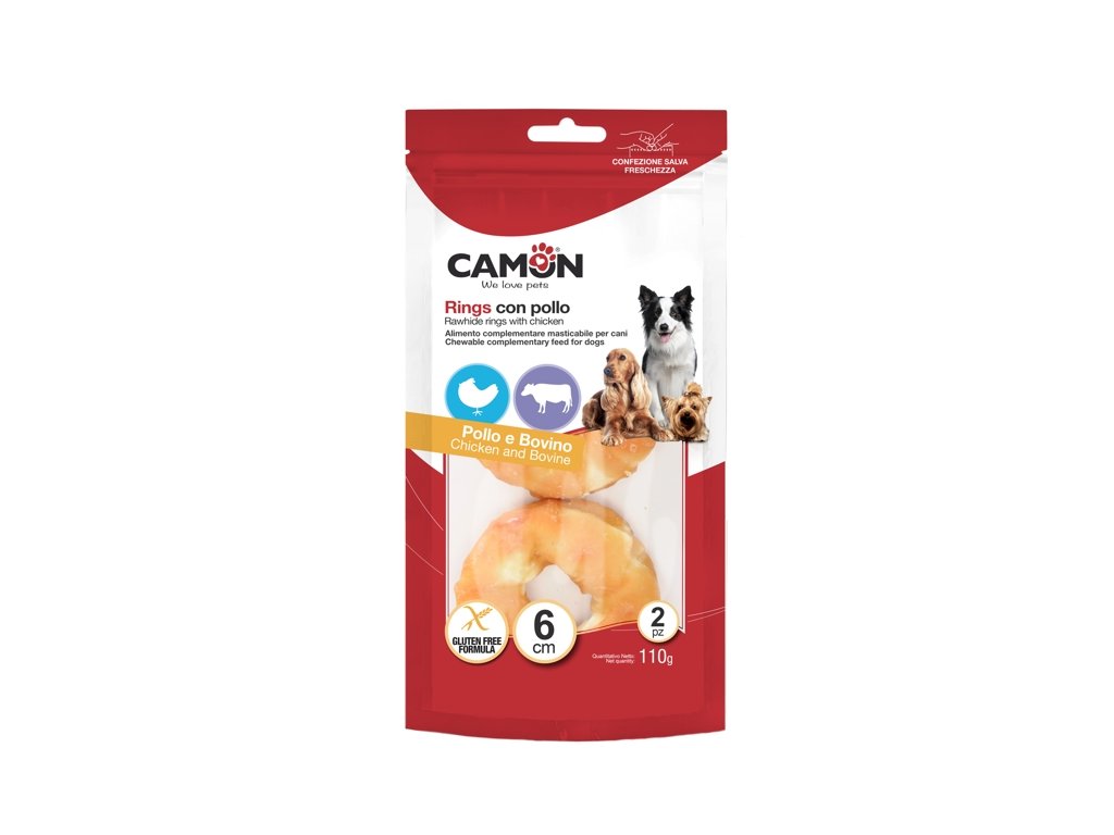 Rawhide rings with chicken (2ks) Diam.6cm-110g- ŽVÝKACÍ KRMIVO PRO PSY. SLOŽENÍ: tepelně upravená a sušená surová kůže 86.4 %, kuřecí maso 12 %, kukuřičný škrob, glycerin, sorbitol, chlorid sodný. ANALYTICKÉ SLOŽKY: Hrubý protein 83.9 %: Hrubá vláknina 0.6 %: Hrubý tuk 1.8 %: Hrubý popel 3.8 %: Vlhkost 18.4 %. POKYNY K POUŽITÍ: Doporučeno pro psy starší 6 měsíců věku. Dávejte 1ks denně (1 kroužek = 50/55g), kousky jako pamlsek nebo odměnu a v návaznosti na to upravte denní porci jídla. Během konzumace nebo žvýkání doplňkového krmiva mějte psa pod dozorem. Pes musí mít vždy k dispozici misku s čerstvou vodou. Skladujte na chladném a suchém místě. Před použitím odstraňte deoxidizer. Váha(net) 110g. Vyrobeno a baleno v továrně pod schvalovacím číslem 3700PF022.Doplňkové parametry