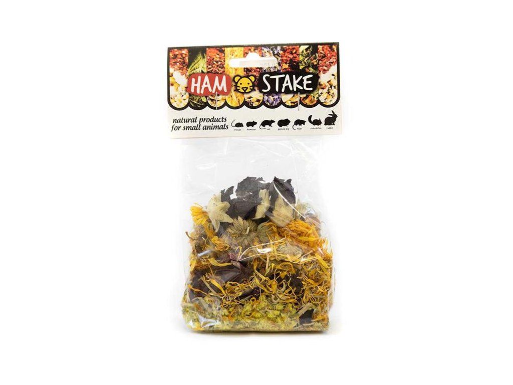 Neodolatelně voňavé sušené květy smilu, ibišku, měsíčku a slézu Ham-Stake jsou ideálním zdravým a lahodným pamlskem, kterým potěšíte každého hlodavého drobného savce a zpestříte jeho jídelníček. Obsahuje množství přirozeně se vyskytujících vitamínů, minerálů a dalších zdraví prospěšných látek. Ibišek, měsíček lékařský, smil a sléz černý mají protizánětlivé a antibakteriální účinky, upravují zažívání, čistí organizmus a celkově posilují imunitu vašich mazlíčků.