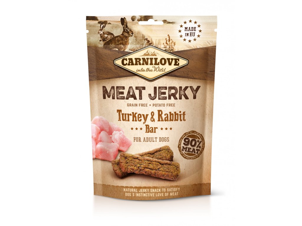 Carnilove Jerky krůtí tyčinka s králíkemSušené masové pamlsky ve formě tyčinek pro dospělé psy. Carnilove Jerky Snack je zdravým, masitým a chutným doplňkem pravidelné stravy vašeho psa. Podávejte denně za odměnu nebo jako pamlsek při společně strávených chvílích během dne.