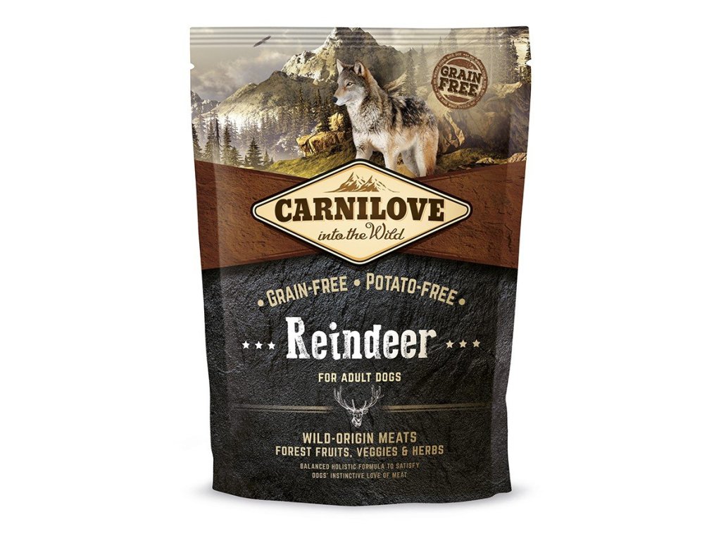 Carnilove Reindeer for AdultCarnilove Adult Reindeer obsahuje 28% masa ze soba a 22% masa z divokého prasete. Vyvážená receptura obsahující jablka, hrách, mrkev a velké množství vitaminů i rostlinných extraktů zajistí psům velkých plemen všechny živiny, které potřebují pro aktivní život. Krmivo neobsahuje obiloviny, brambory, kukuřici, sóju ani rýži, proto jej lze podávat i při alergiích či zjištěné intoleranci vůči určitým složkám stravy.