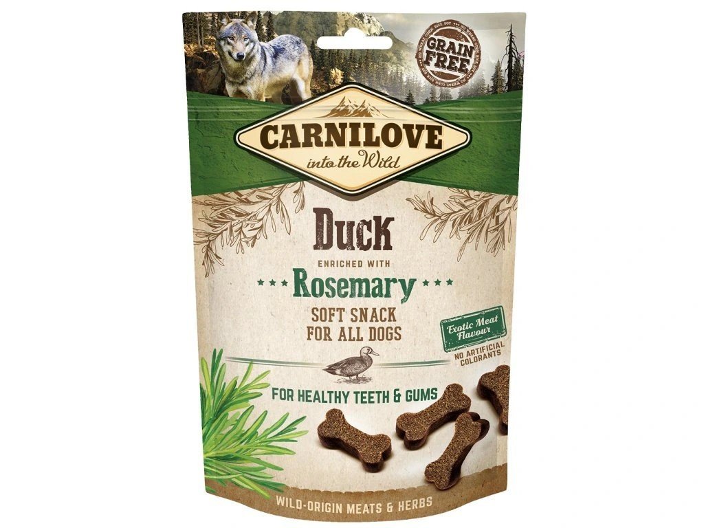 Carnilove Dog Semi Moist Snack Duck with Rosemary 200 gDelikátní poloměkké pamlsky Carnilove pro psy. Bez obilovin, sóji a brambor. Touto pochoutkou potěšíte každého pejska, snadno se žvýká, skvěle voní a díky 35% obsahu sušeného kachního masa úžasně chutnají. Obohaceno rozmarýnem, kachní a drůbeží šťávou a hráškem. Rozmarýn pečuje o zdraví zubů a dásní.