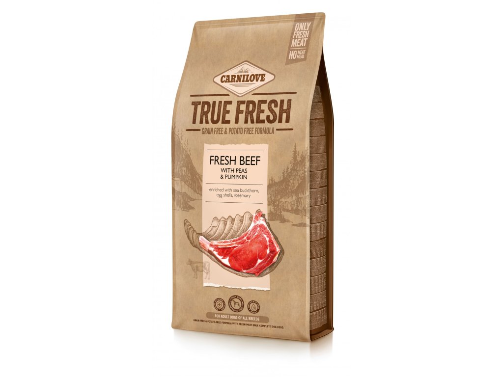 Carnilove True Fresh BEEF for Adult dogsKvalitní a vyvážená strava pro dospělé psy všech plemen s vysokým podílem čerstvého hovězího masa (60 %) z lokálních zdrojů s přídavkem hrášku a vaječné skořápky, které obsahují důležité minerály sloužící při mineralizaci kostí. Kompletní krmivo bez obilovin a brambor, obohacené o rakytník, rozmarýn a dýni. Dýně je vysoce kvalitním zdrojem vlákniny, která podporuje zdraví zažívacího traktu a zajišťuje efektivní vstřebávání základních živin, zatímco rakytník a rozmarýn mají antioxidační vlastnosti a chrání tělo před vlivy volných radikálů.