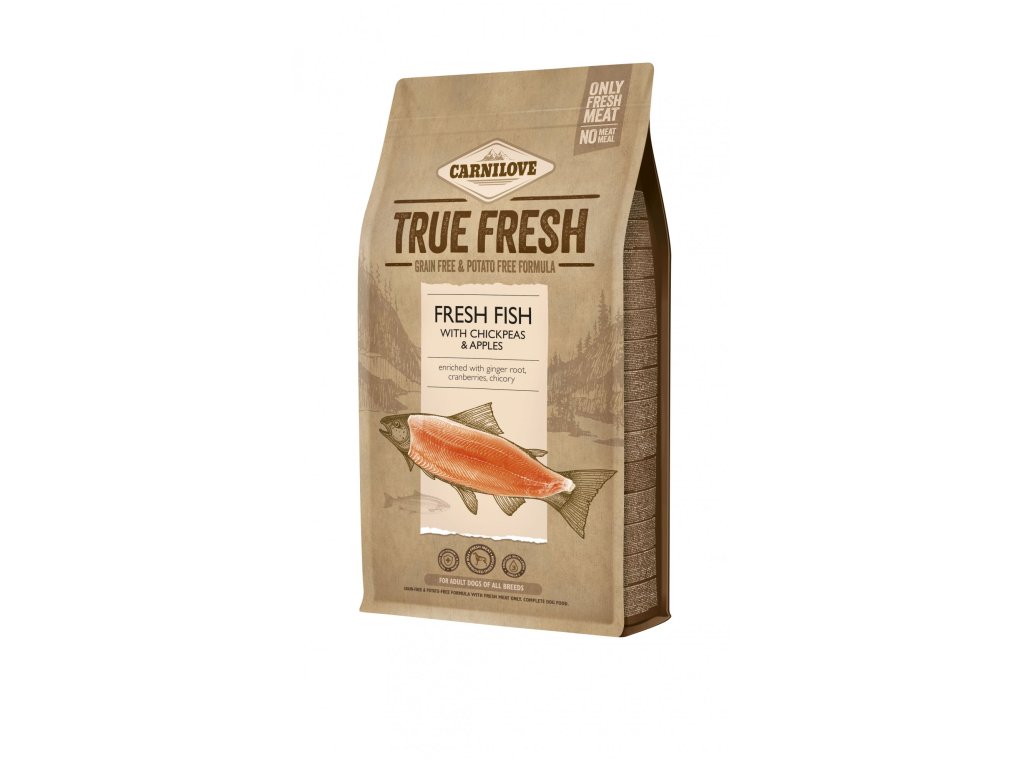 Carnilove Dog Fresh Fish je vysoce kvalitní holistické krmivo, jehož receptura obsahuje vysoký podíl masa ryb ze Severního moře i sladkovodních ryb z rybníků jižních Čech. Ryby pocházejí výhradně z udržitelně řízeného rybolovu. Přidaná cizrna je přirozeným zdrojem rostlinných bílkovin a minerálních látek nutných pro zdravý metabolismus. Jablka jsou vynikajícím zdrojem vlákniny nezbytné pro celkové zdraví zažívacího traktu. Zázvor a brusinky poskytují důležité antioxidanty a pomáhají budovat silnou přirozenou imunitu, zatímco kořen čekanky plní díky obsahu inulinu funkci prebiotika. Krmivo obsahuje maso divokého původu, lesní plody, zeleninu a bylinky. Neobsahuje obiloviny ani brambory. Jedinečná chuť rybího masa uspokojí přirozenou psí touhu po chuti masa.