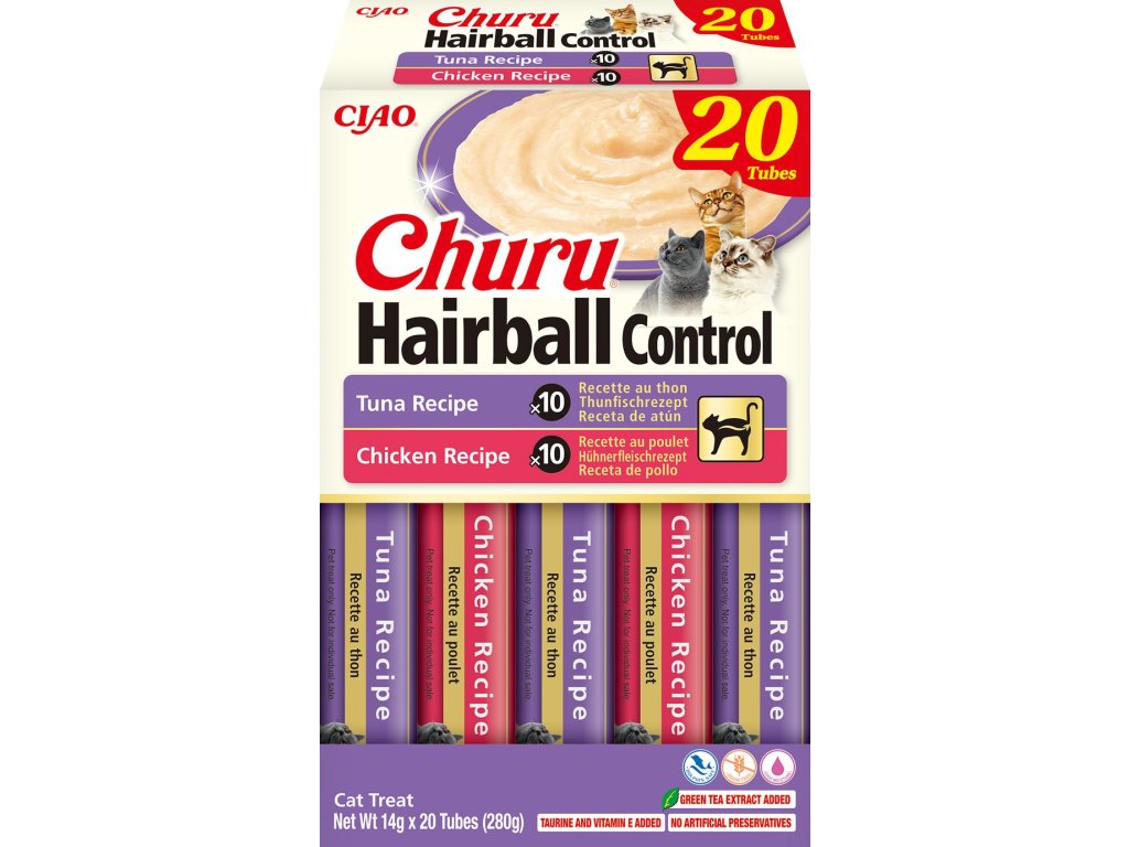 Churu Hairball Control ve variaci s tuňákem a kuřetem, funkční pamlsek na podporu trávení chlupů. Kočky tráví 30-50 % bdělého času péčí o srst. Pomozte předcházet vzniku trichobezoárů díky chuti a složení našeho krémového pyré Churu. Nerozpustná rostlinná vláknina a chitosan, což je rovněž nerozpustná vláknina ze schránek korýšů, pomáhají podporovat zdravý trávicí trakt a kontrolovat tvorbu trichobezoárů. Dále obsahuje taurin a vitamín E. Taurin je esenciální aminokyselina, kterou kočky potřebují k udržení zdravého zraku, správné funkce nervů a silného imunitního systému. Vitamín E je v kočičí stravě nezbytný a pomáhá chránit buňky před oxidačním poškozením. Dalším benefitem pamlsku Churu je vysoký obsah vody, který napomáhá udržovat celkové zdraví koček. Churu pamlsky jsou nízkokalorické, bez obilovin, konzervačních látek a umělých barviv. Obsahují vysoce kvalitní bílkoviny, jelikož jsou vyrobené z čerstvého masa z hlubokomořských tuňáků.