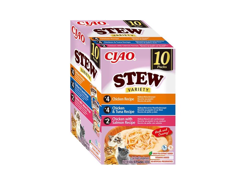 Ciao STEW Multipack obsahuje 10 kapsiček trhaného kuřecího masa trhaného kuřecího masa v lahodném krémovém vývaru v různých variantách. Pečlivě vybrané suroviny a přísně kontrolovaná čerstvost. Vaše kočka si bude užívat lákavou aromatickou chuť při každém otevření kapsičky! Vyrobeno ze 100% čistého kuřecího prsa a mořského tuňáka. Žádné obiloviny, konzervanty ani umělá barviva. Vysoký obsah vody, který je prospěšný pro celkové zdraví koček. Nízký obsah kalorií.