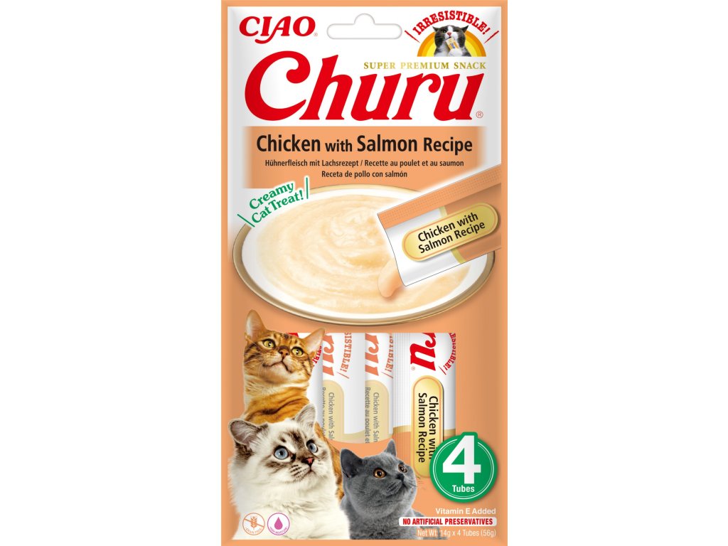 Churu cat masové pyré - kuře, lososChuru masové pyré pro kočky s kuřecím z farmy a lososem. Lahodný, přírodní pamlsek krémové konzistence bez obilovin. Zdravé mlsání s nízkým obsahem kalorií, bez konzervantů, chemických aromat, bez barviv a umělých dochucovadel. Masové pyré můžete také podávat stejně jako jinou kočičí kapsičku přímo z misky nebo ho můžete přidat ke granulím pro vylepšení jejich chuti.