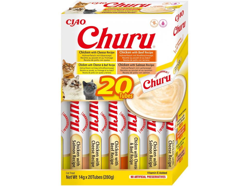 Churu cat masové pyré mix - kuře, hovězí 280 g (balení)Výběr krémových pamlsků Churu ve variaci s kuřetem. Zdravé mlsání s nízkým obsahem kalorií, bez konzervantů, chemických aromat, bez barviv a umělých dochucovadel. Inovativní měkká konzistence pamlsku Churu vám umožní trávit společné chvíle s vaší kočičkou hravým a interaktivním způsobem. Kočičí pamlsky Churu mají vysoký obsah vody a díky tomu jsou vhodným doplňkem k suchému krmivu nebo pro kočky, které málo pijí. Pamlsky Churu jsou 100% přírodní a zdravé mlsání pro kočky všech věkových kategorií. Churu jsou ideální pro ukrytí tablety na odčervení či jiného léku, který je potřeba kočce nenásilně podat.