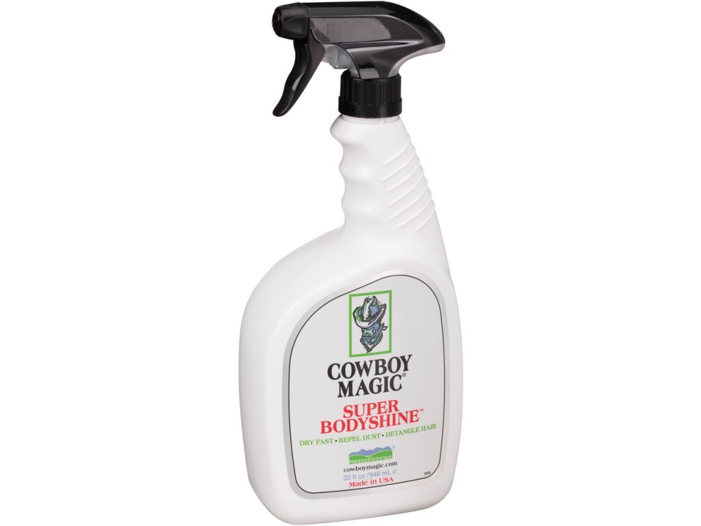 Cowboy Magic Super Bodyshine® ochraňuje srst před usazováním prachu, písku a nečistot ze stájí. Zanechává srst s hedvábným leskem a příjemnou vůní. Rychle působí a nedráždí. Stačí aplikovat pomocí rozprašovače.