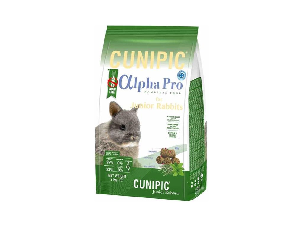Cunipic Alpha Pro Junior Rabbit – mladý králík. Kompletní krmivo bez obsahu obilovin. Zdravá, velice chutná a vyvážená receptura pro mladé králíky (do 6 měsíců věku). Každá granule obsahuje všechny nezbytné suroviny a vitamíny pro zdraví králíka bez výkyvů v příjmu živin. Krmivo s vysokým obsahem vlákniny (23 %), bez přidaných barviv a cukrů vhodné pro všechna plemena.