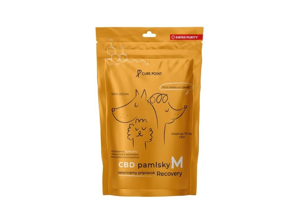 Curepoint CBD pamlsek Recovery M 100 gDoplňkové chutné pamlsky pro psy středních plemen (10 – 35kg) zlepšující vitalitu a zdraví vašeho miláčka. Krmivo je vyrobeno z prémiových surovin s cílem maximalizovat blahodárný efekt výrobku. Klíčovou přísadou je kurkuma, která má významné antioxidační a protizánětlivé účinky. Výrobek je 100% veganský a díky svému složení může být nápomocný v předcházení nebo boji proti artritidě a bolestem kloubů pejska. Díky účinné látce CBD krmivo působí antistresově a relaxačně. I proto může významně pomoci při stresových situacích (např. ohňostroje, bouře, cesta autem) vašeho čtyřnohého miláčka. Pamlsky mají výbornou chuť, díky které je mají pejsky velmi rádi. Krmivo je zároveň na Slovensku a v České republice registrováno jako veterinární přípravek. Výrobek je schválen na Slovensku a v České republice pod registračním číslem 183/R/22-S a 146-23/S.