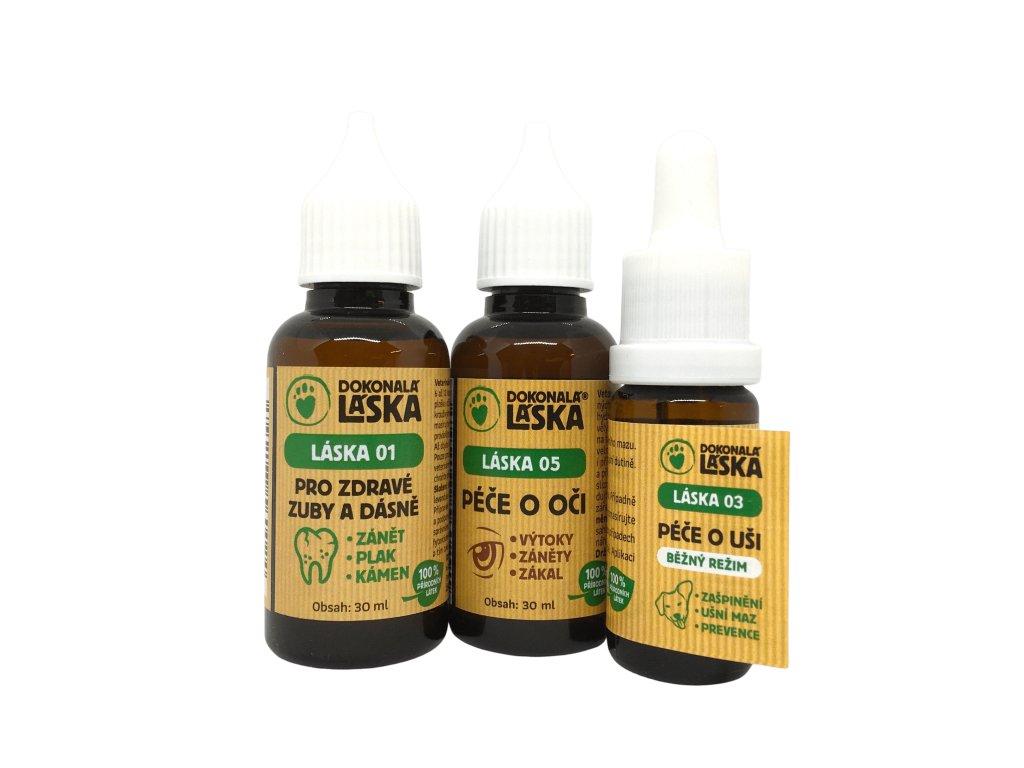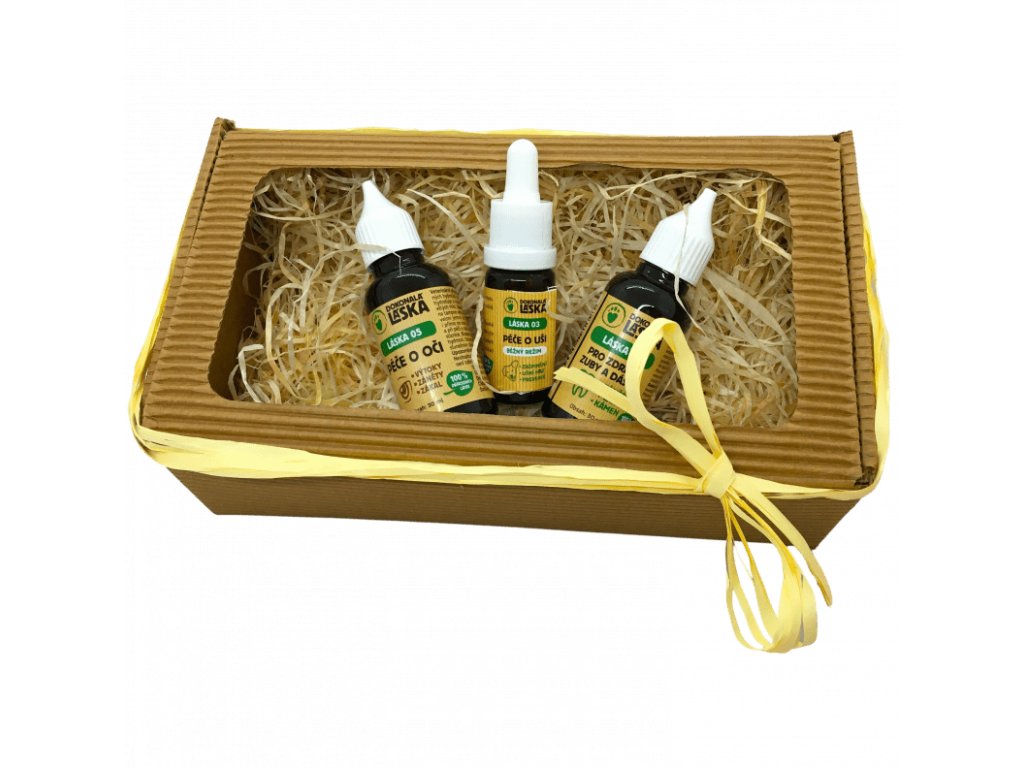 Balíček obsahuje: LÁSKA 01 – Pro zdravé zuby a dásně 30 ml, LÁSKA 03 – Péče o uši v běžném režimu 10 ml a LÁSKA 05 – Péče o oči 30 ml. DÁRKOVÉ BALENÍ V CENĚ.