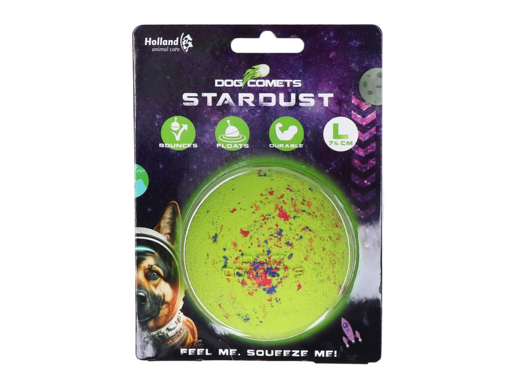 Stardust míček je vyroben z přírodního kaučuku, který dokonale skáče a je velmi odolný. Pejsci jsou nadšeni, jak pohodlně se žvýká a majitelé zase tím, že vydrží, při žvýkání masíruje dásně a udržuje psí zoubky čisté. Míček lze po hraní snadno opláchnout, protože je voděodolný.