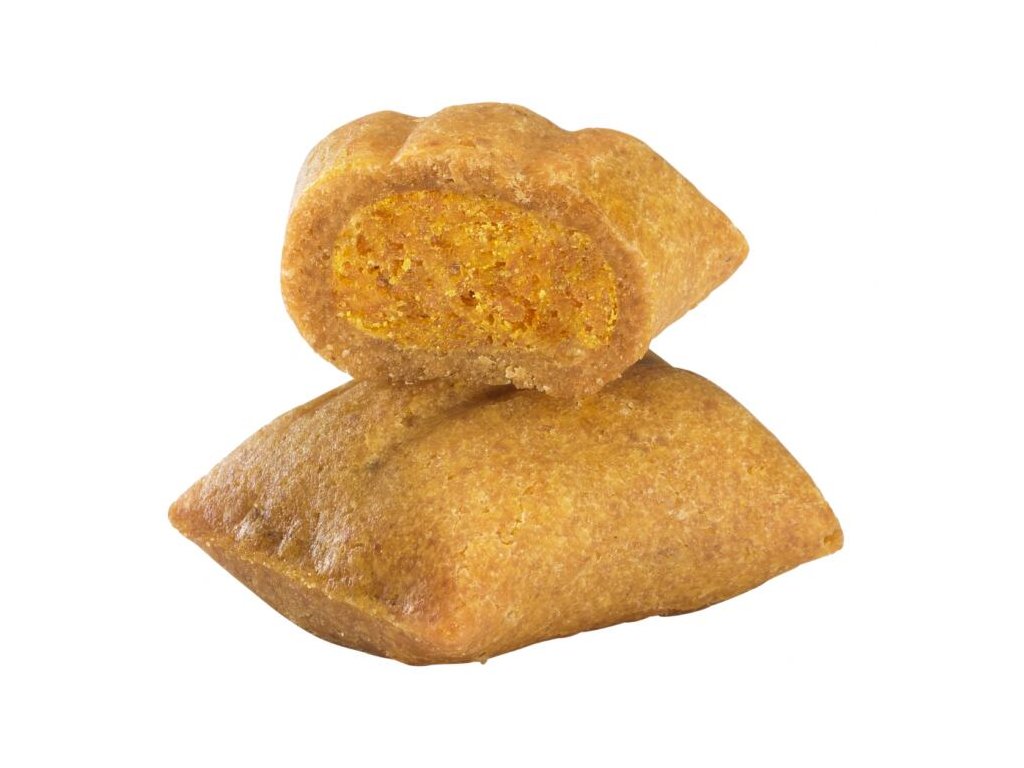 Polštářky DoggyeBreak si rychle získají srdce každého psa! Spojení lososa, mrkve, dýně a červené řepy nabízí neobvyklou chuť, která podpoří motivaci při tréninku a zpříjemní společně strávený čas. Měkká konzistence, lahodná náplň a silná vůně jsou lákadlem pro pejsky všech velikostí i věkových kategorií. Pamlsky jsou monoproteinové – jediným zdrojem živočišných bílkovin je losos, který je snadno stravitelný a bohatý na omega-3 mastné kyseliny. Neobsahují obiloviny, přidaný cukr ani umělá barviva či dochucovadla. Mrkev, dýně a červená řepa dodává důležité vitamíny, vlákninu i antioxidanty pro celkovou pohodu a podporu imunity. Psyllium přispívá ke zdravému trávení. Kokosový a lososový olej podporují kvalitu srsti i pokožky. Měkké polštářky s náplní Monoproteinové složení Bez obilovin, umělých barviv a přísad S lososem, mrkví, dýní a červenou řepou Lososový a kokosový olej pro zdravou a lesklou srst Ruční výroba v Itálii Stejně jako všechny pamlsky DoggyeBag, i tyto polštářky vznikají v malé řemeslné výrobně v Itálii z čerstvých surovin vhodných pro lidskou spotřebu, a jsou baleny v recyklovatelném papírovém obalu. Složení: losos (20 %), hrachový škrob, tapiokový škrob, glycerin, mrkev (5,8 %), lososový olej, bramborový škrob, bramborové vločky, sušená dýně (2,9 %), prášková celulóza, kokosový olej, dýňová mouka (1,3 %), hydrolyzovaný lososový protein, psyllium, sušená červená řepa, kurkuma Doplňkové látky na 1 kg: Regulátor kyselosti: kyselina citrónová 1300 mg Analytické složky: hrubé bílkoviny 9,78 %, hrubý tuk 12,60 %, hrubá vláknina 3,44 %, hrubé popeloviny 3,28 %, vlhkost 16 % Hmotnost: 180 gDoplňkové parametry