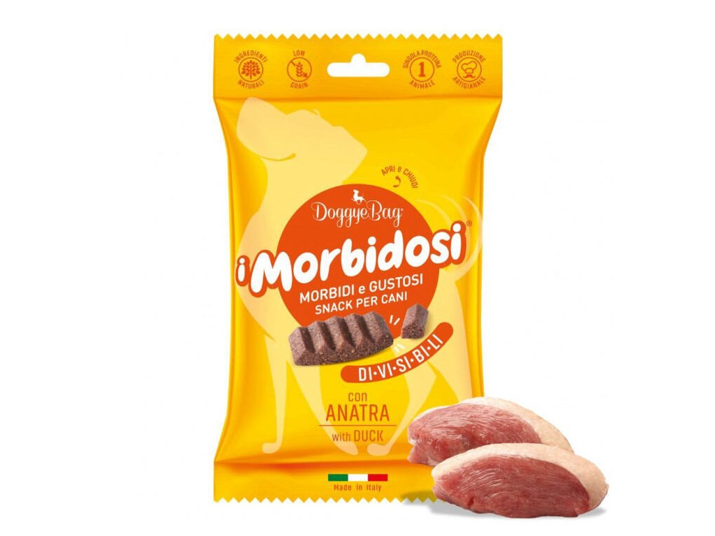 Měkké pamlsky Morbidosi jsou perfektní volnou na výlety i tréninky! Díky speciálnímu tvaru je snadno rozdělíte na menší kousky, takže se skvěle hodí pro psy všech velikostí. Jsou vyrobeny z přírodních surovin a jediným zdrojem živočišného proteinu je kachní maso – jsou tedy monoproteinové a vhodné i pro psy s alergiemi. Obohaceny o sušenou červenou řepu, kurkumu a psyllium – rozpustnou vlákninu, která působí jako prebiotikum a podporuje zdravé trávení. Neobsahují barviva, přidaný cukr, sůl ani jiná dochucovadla. Měkké, snadno dělitelné Pro psy všech velikostí a věkových kategorií Monoproteinové – s kachním masem Bez lepku, barviv a dochucovadel Ruční výroba v Itálii Balení pamlsků Morbidosi je navrženo s praktickým otvíráním uprostřed a vyrobeno z plně recyklovatelného papíru. Stejně jako všechny pamlsky DoggyeBag jsou ručně vyráběny v řemeslné dílně v Itálii výhradně z čerstvých surovin určených pro lidskou spotřebu. Složení: kachna (24 %), mouka z pufované rýže, hrachový škrob, živočišný tuk (čisté vepřové sádlo), prášková celulóza, psyllium, sušená červená řepa, kurkuma Doplňkové látky na 1 kg: Regulátor kyselosti: kyselina citrónová 1300 mg Analytické složky: hrubé bílkoviny 20,84 %, hrubý tuk 10,70 %, hrubá vláknina 1,81 %, hrubé popeloviny 5,46 %, vlhkost 16 % Hmotnost: 90 gDoplňkové parametry