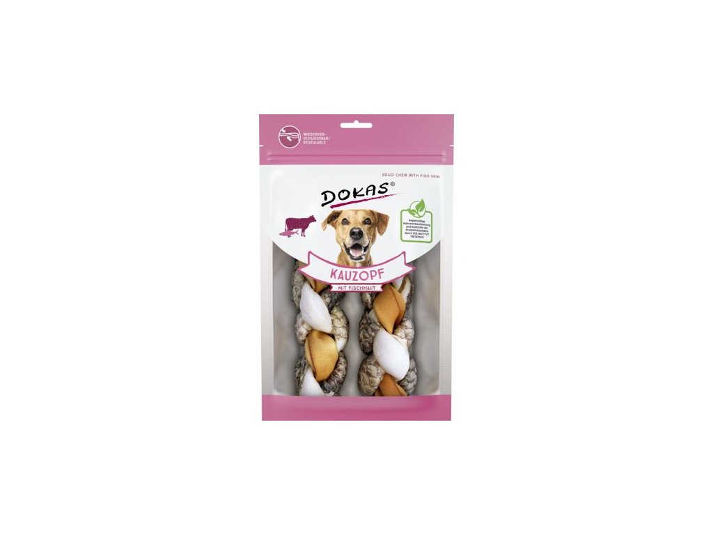 Neodolatelné copánky v kombinaci hovězí a rybí kůže zaujmou na první pohled. Skvělá netradiční pochoutka pro zabavení vašeho pejska. Žvýkání pomáhá udržovat zdravé zuby a dásně. Jsou velmi oblíbené pro své přírodní složení. Pamlsky Dokas jsou bez konzervantů, umělých barviv, dochucovadel a glycerinu. Sáček má praktické uzavírání, pamlsky tak zůstanou déle čerstvé a voňavé. Složení: hovězí kůže 75%, rybí kůže (tilápie) 25% Analýza: hrubé bílkoviny 95,0%, hrubé oleje a tuky 2,5%, hrubé popeloviny 1,9%, hrubá vláknina 0,5%, vlhkost 11% Podávejte jako odměnu. Zajistěte dostatek pitné vody. Po otevření pečlivě uzavřete zipem a skladujte v suchu a chladu. Balení obsahuje kyslíkový absorbér pro uchování kvality výrobku. Pamlsky jsou v dnešní době nedílnou součástí krmení mazlíčků, a tak i u nich je potřeba dbát nejen na chuť, ale i na zdravé složení. U pamlsků Dokas máte jistotu, že všechny použité suroviny splňují přísná kritéria a jsou během výroby pravidelně prověřovány. Psí a kočičí pamlsky Dokas podléhají pravidelným kontrolám kvality světově uznávaným německým institutem SGS Institut Fresenius. Tato nezávislá laboratoř patří mezi přední evropské společnosti testující kvalitu potravin. Jaké suroviny najdete ve složení pamlsků Dokas? Maso Maso je jednou z hlavních složek psí a kočičí potravy. Z toho důvodu tvoří největší podíl také v našich pamlscích. Je pečlivě vybíráno a šetrně zpracováno tak, aby výsledný produkt obsahoval vysoce kvalitní bílkoviny a tuky. Ryby Ryby jsou výbornou alternativou k masovým pamlskům. Obsahují vysoké procento nenasycených mastných kyselin. Omega 3 mastné kyseliny pomáhají udržovat zdravou kůži a lesklou srst. Ovoce a zelenina Vitamíny a stopové prvky v ovoci a zelenině jsou zdravé nejen pro lidi, ale také pro naše čtyřnohé přátele. Rádi kombinujeme maso a ryby s vybranými lehce stravitelnými druhy, jako je jablko, banán, mango, mrkev a batát. Hovězí a vepřová kůže Kosti vyrobené hovězí a vepřové kůže pomáhají pečovat o zuby vašeho psa a také jej umí perfektně zabavit. Kombinujeme je s masem či rybí kůží, což zvyšuje jejich oblíbenost. Díky těmto žvýkacím pamlskům nebude mít váš pes potřebu kousat vaše boty či zařízení bytu. Sůl Psi potřebují sůl zejména pro tvorbu kyseliny chlorovodíkové v jejich žaludku a k udržení správné funkce nervové soustavy. Její nadbytek však není žádoucí, proto přidáváme do našich pamlsků pouze malé množství, méně jak 0,3%. Kvasnice Kvasnice obsahují vysoký obsah proteinu, vitamínů a minerálů. Pomáhají udržovat zdravou kůži a srst. Rostlinné produkty Získáváme je při zpracování rostlinných surovin, například zeleniny a luštěnin. Nepoužíváme žádné odpady z rostlinné výroby a plnidla. Minerální látky Minerální látky jsou nezbytnou součástí výživy psa, jehož organismus si je nedokáže sám vyrobit. Používáme pouze malé množství soli (méně než 0,3%).Doplňkové parametry