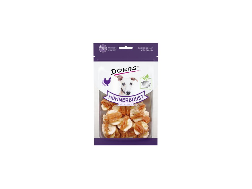 Zdravá kombinace sušených kuřecích prsou a banánů plná živin. Ideální pro milovníky dobrého masa a sušeného ovoce. Vysoká kvalita použitých surovin zaručuje výraznou chuť a vůni. Jsou velmi oblíbené pro své přírodní složení. Pamlsky Dokas jsou bez konzervantů, umělých barviv, dochucovadel a glycerinu. Sáček má praktické uzavírání, pamlsky tak zůstanou déle čerstvé a voňavé. Složení: filet z kuřecích prsou 57%, banán 35%, vedlejší rostlinné produkty, minerální látky Analýza: hrubé bílkoviny 33,3%, hrubé oleje a tuky 12,3%, hrubé popeloviny 2,8%, hrubá vláknina 0,5%, vlhkost 11% Podávejte jako odměnu. Zajistěte dostatek pitné vody. Po otevření pečlivě uzavřete zipem a skladujte v suchu a chladu. Balení obsahuje kyslíkový absorbér pro uchování kvality výrobku. Pamlsky jsou v dnešní době nedílnou součástí krmení mazlíčků, a tak i u nich je potřeba dbát nejen na chuť, ale i na zdravé složení. U pamlsků Dokas máte jistotu, že všechny použité suroviny splňují přísná kritéria a jsou během výroby pravidelně prověřovány. Psí a kočičí pamlsky Dokas podléhají pravidelným kontrolám kvality světově uznávaným německým institutem SGS Institut Fresenius. Tato nezávislá laboratoř patří mezi přední evropské společnosti testující kvalitu potravin. Jaké suroviny najdete ve složení pamlsků Dokas? Maso Maso je jednou z hlavních složek psí a kočičí potravy. Z toho důvodu tvoří největší podíl také v našich pamlscích. Je pečlivě vybíráno a šetrně zpracováno tak, aby výsledný produkt obsahoval vysoce kvalitní bílkoviny a tuky. Ryby Ryby jsou výbornou alternativou k masovým pamlskům. Obsahují vysoké procento nenasycených mastných kyselin. Omega 3 mastné kyseliny pomáhají udržovat zdravou kůži a lesklou srst. Ovoce a zelenina Vitamíny a stopové prvky v ovoci a zelenině jsou zdravé nejen pro lidi, ale také pro naše čtyřnohé přátele. Rádi kombinujeme maso a ryby s vybranými lehce stravitelnými druhy, jako je jablko, banán, mango, mrkev a batát. Hovězí a vepřová kůže Kosti vyrobené hovězí a vepřové kůže pomáhají pečovat o zuby vašeho psa a také jej umí perfektně zabavit. Kombinujeme je s masem či rybí kůží, což zvyšuje jejich oblíbenost. Díky těmto žvýkacím pamlskům nebude mít váš pes potřebu kousat vaše boty či zařízení bytu. Sůl Psi potřebují sůl zejména pro tvorbu kyseliny chlorovodíkové v jejich žaludku a k udržení správné funkce nervové soustavy. Její nadbytek však není žádoucí, proto přidáváme do našich pamlsků pouze malé množství, méně jak 0,3%. Kvasnice Kvasnice obsahují vysoký obsah proteinu, vitamínů a minerálů. Pomáhají udržovat zdravou kůži a srst. Rostlinné produkty Získáváme je při zpracování rostlinných surovin, například zeleniny a luštěnin. Nepoužíváme žádné odpady z rostlinné výroby a plnidla. Minerální látky Minerální látky jsou nezbytnou součástí výživy psa, jehož organismus si je nedokáže sám vyrobit. Používáme pouze malé množství soli (méně než 0,3%).Doplňkové parametry