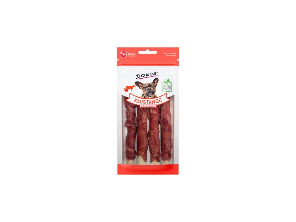 Oblíbené tyčinky z hovězí kůže potažené kachním prsním filetem jsou klasikou, která neomrzí. Jejich žvýkání psy zabaví, posiluje žvýkací svaly a pomáhá udržovat zdravé zuby a dásně. Stejně jako všechny pamlsky Dokas, i tato pochoutka je bez konzervantů, umělých barviv, dochucovadel a glycerinu. Složení: hovězí kůže 54 %, filet z kachních prsou 41 %, vedlejší rostlinné produkty, minerální látky Analýza: hrubé bílkoviny 83,4 %, hrubé oleje a tuky 2,6%, hrubé popeloviny 3,2%, hrubá vláknina 0,5%, vlhkost 15% Podávejte jako odměnu. Zajistěte dostatek pitné vody. Po otevření pečlivě uzavřete zipem a skladujte v suchu a chladu. Balení obsahuje kyslíkový absorbér pro uchování kvality výrobku. Pamlsky jsou v dnešní době nedílnou součástí krmení mazlíčků, a tak i u nich je potřeba dbát nejen na chuť, ale i na zdravé složení. U pamlsků Dokas máte jistotu, že všechny použité suroviny splňují přísná kritéria a jsou během výroby pravidelně prověřovány. Psí a kočičí pamlsky Dokas podléhají pravidelným kontrolám kvality světově uznávaným německým institutem SGS Institut Fresenius. Tato nezávislá laboratoř patří mezi přední evropské společnosti testující kvalitu potravin.Doplňkové parametry