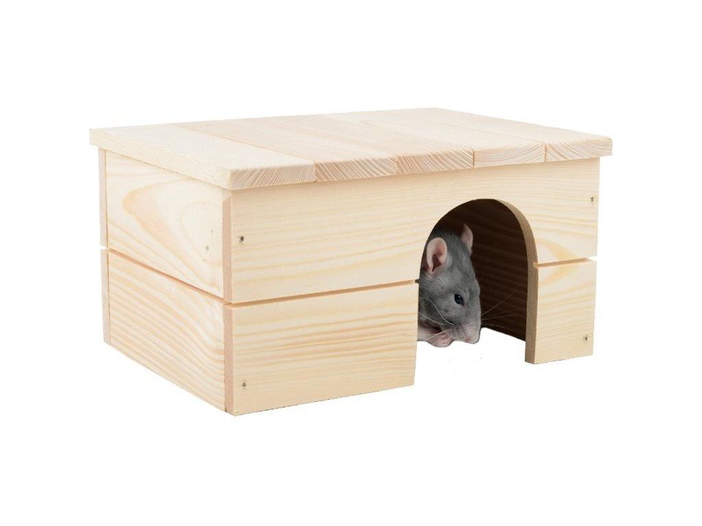 Dřevěný domeček s rovnou střechou pro morče, osmáka a jiné drobné hlodavce.