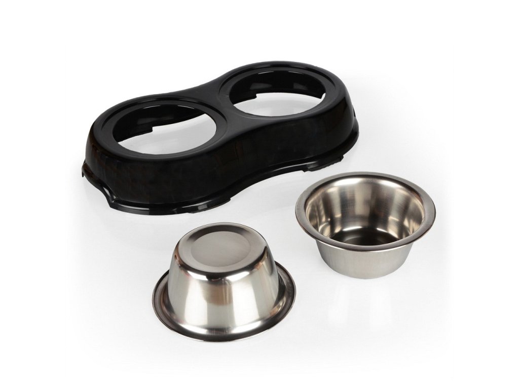 Dvě nerezové misky v černém plastovém stojanu, které lze nezávisle na sobě snadno vyjmout, a které lze omýt.