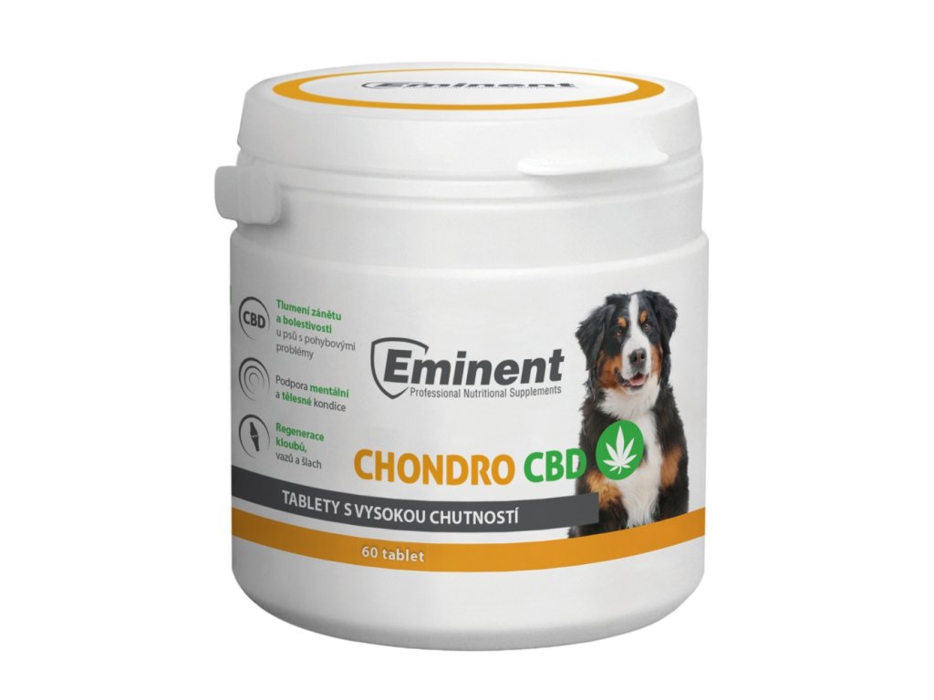 Eminent Chondro CBD je speciálně vytvořený doplněk stravy ve formě tablet, obsahující látky které se podílejí na udržení zdraví kloubní chrupavky, zabezpečují obnovu buněk a tlumí zánětlivé procesy, které onemocnění provázejí. Výsledkem je zlepšení pohybu a nálady Vašeho psa. Díky obsahu sedmi aktivních látek včetně kanabidiolu (CBD) nejen regeneruje a chrání kloubní chrupavku, ale také pomáhá tlumit bolest, zánět a stres, čímž přispívá ke zlepšení celkové pohody psa.