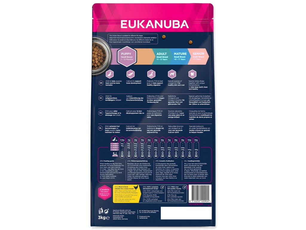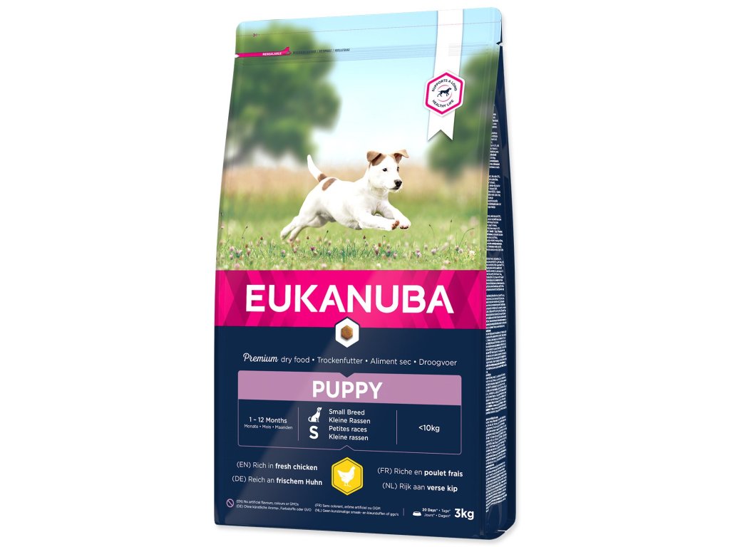 Nová EUKANUBA vylepšená receptura se zaměřením na konkrétní fázi života - pro štěňata malých plemen psů od 1 do 12 měsíců – poskytuje na míru upravenou výživu pro podporu růstu a rozvoje vašeho štěněte. Naše jedinečná na míru upravená receptura pro štěňata malých plemen psů obsahuje DHA, díky které se štěňata rychleji učí a snáze se cvičí, směs vlákniny, prebiotika FOS a řepné dužiny pro podporu zdravého zažívání, vápník pro zdravý růst kostí a přirozený zdroj mastných kyselin omega-6 a omega-3 pro zdravou kůži a srst. Naše unikátní granule ve tvaru šestiúhelníku s přídavkem DentaDefense také pomáhají s udržováním čistých a zdravých zubů. Pokročilá výživa pro štěňata malých plemen psů se zaměřením na podporu optimálního tělesného stavu a celoživotní pohodu.