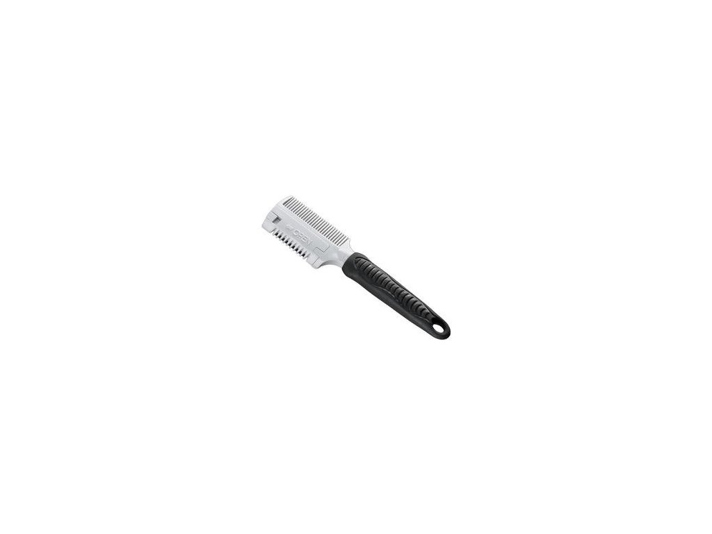 FERPLAST prořezávač oboustranný 5991FERPLAST prořezávač je oboustranný hřeben s břitvou, užitečný pro stříhání všech typů psů. Má pevnou rukojeť se dvěma různě velkými plastovými hřebeny. Prodává se kompletní s čepelí.