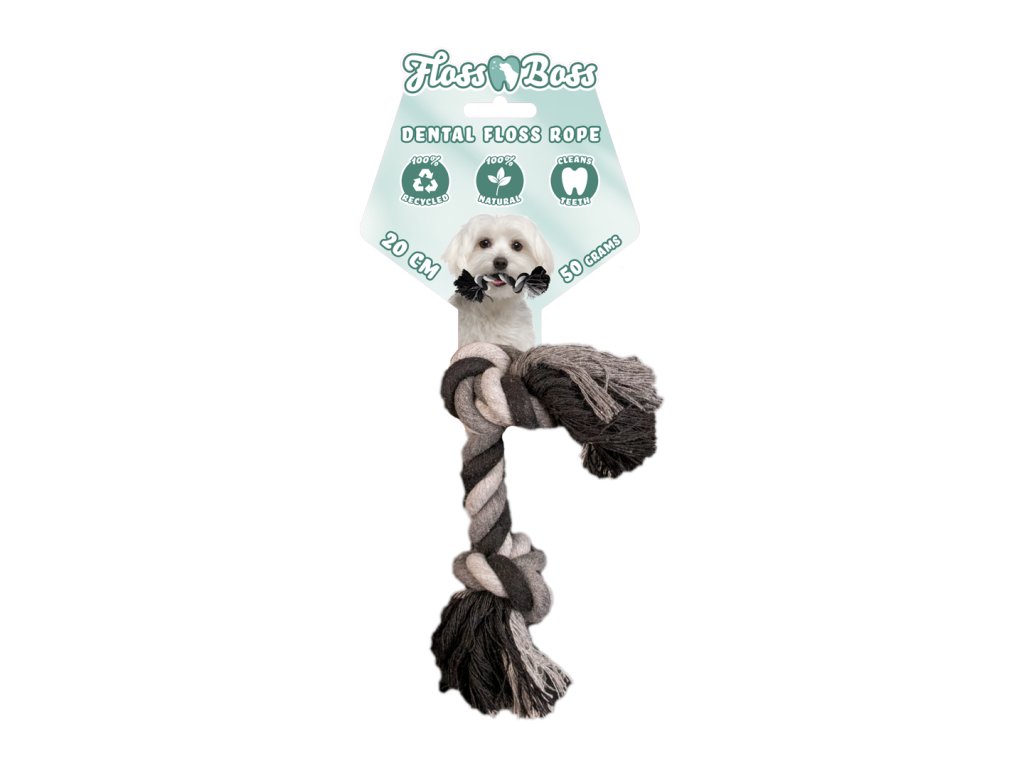 Provazové lano pro malé psy a štěňata ze 100% bavlny skvěle napomáhá k čištění zubů při společné hře. Bavlněný uzel je ideální pro aportovací a přetahovací hry se psy.Během hry pomáhají Floss Boss Dental čistit zuby a dásně. Robustní nitě se dostanou i do těžko přístupných míst, jako je prostor mezi zuby. Díky 100% přírodní bavlně bez jakýchkoliv umělých příměsí je lano bezpečné i při nechtěném polknutí odžvýknutých nití.