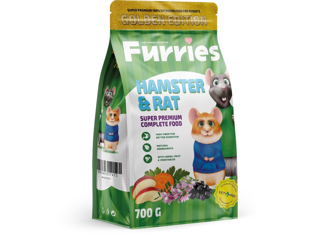 Furries Extrudované granule křeček, potkan a myšSuperprémiové kompletní krmivo pro křečky, myši a potkany s velkým množstvím vlákniny, ovoce a dalších přírodních surovin. Granule obsahují omega-3 nenasycené mastné kyseliny, ostropestřec mariánský na podporu zdravého trávením, extrakt z juky schidigera nebo pivovarské kvasnice jako zdroj skupiny vitaminů B. Toto oblíbené krmivo nejen že bude vašemu miláčkovi chutnat, ale také mu dodá všechny potřebné živiny a minerální látky.