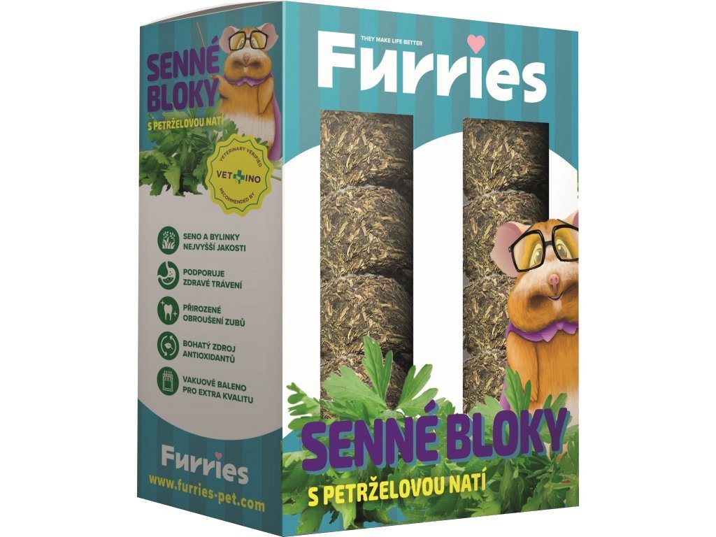 Furries senné bloky z českých luk s petrželovou natíFurries senné bloky z českých luk s petrželovou natí jsou perfektní pro zdravé zuby vašeho mazlíčka. Vysoký obsah antioxidantů podporuje správné trávení. Seno té nejvyšší kvality pocházející z českých luk je slisované do bloků a vakuově balené. Senný blok je bezprašný, díky tomu zůstává ubikace zvířete déle čistou a jiná forma podávání sena je zpestřením jídelníčku zvířete. Seno se podílí na důležitých funkcích těla pro udržení zdraví zvířat a vysoká kvalita produktu zvyšuje chutnost a stravitelnost produktu. Tvar a tvrdost jednotlivých stébel trav a bylin nutí zvíře mělnit a tím dochází k žádoucímu obrušování zubů.