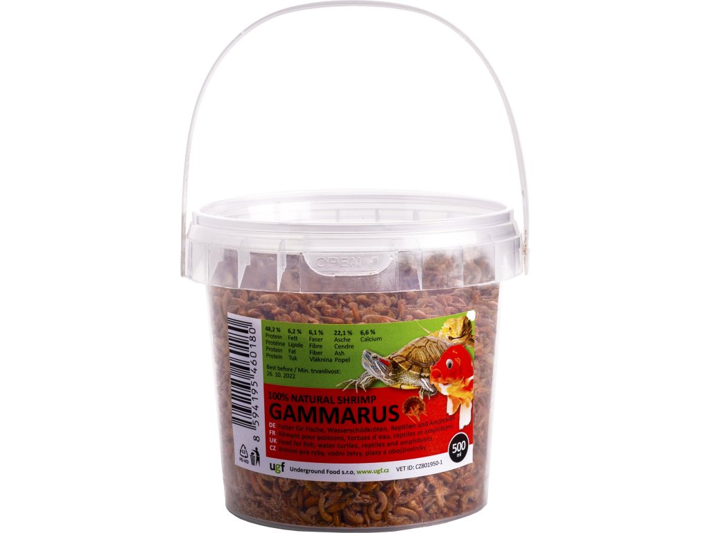 Gammarus 500 mlGammarus je blešivec, který patří do rodu korýšů. Je vhodný jako přírodní doplňkové krmivo pro vodní, suchozemské želvy a ostatní terarijní zvířata, ryby, ptáky a malé hlodavce. Chutný pamlsek obsahuje vysoce kvalitní proteiny (48,2 %), zdravé tuky (6,2 %) a minerální látky (především vápník) potřebné pro přirozený růst krunýře a kostí.