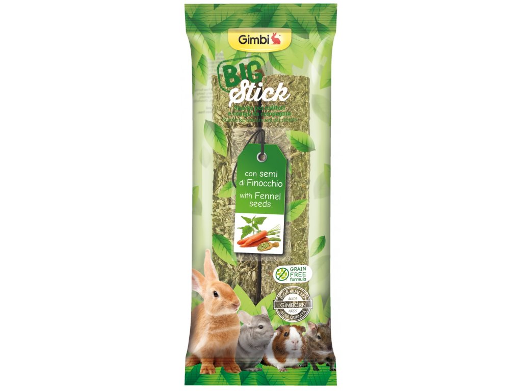 GIMBI Big stick s fenykovými semínkyLahodný pamlsek ve tvaru tyčinky, vyrobený z rostlinných surovin, zcela bez obilovin a s praktickou šňůrkou z přírodního materiálu k připevnění ke kleci. Tyčinku ocení především domácí králíci, morčata, činčily nebo osmáci degu. Obsahuje semena fenyklu, které mají blahodárné účinky na trávicí soustavu a sušenou kopřivu, známou svými očistnými účinky. Balení zajišťuje, aby výrobek měl zachovány všech vlastnosti tím nejlepším možným způsobem a předešlo se možné kontaminaci způsobené teplem nebo hmyzem. Bez antioxidantů, barviv a aromat, umělých konzervačních látek, přidaných cukrů.