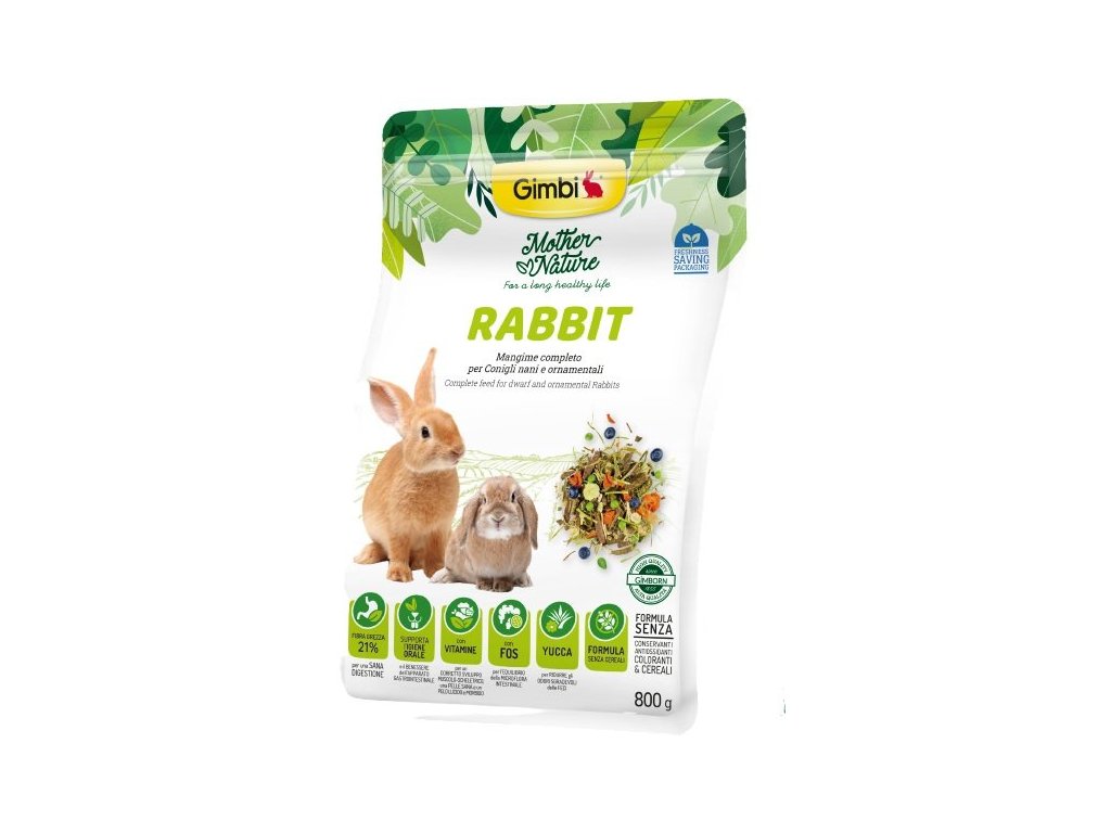 GIMBI MOTHER NATURE králík 800gKrmivo obsahuje potřebné množství bílkovin, tuků a vitamínů. Vysoký obsah hrubé vlákniny prospívá trávení. Vitamíny pro dobré kosti, svaly, zdravou kůži a lesklou srst. FOS a prebiotika juky zmírňují zápach stolice.