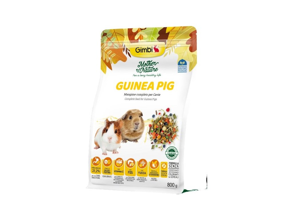 GIMBI MOTHER NATURE morče 800gKvalitní krmivo od GIMBI naplňuje vysokou potřebu vlákniny a vitamínu C morčat pro správnou funkci kloubů a podporu imunitního systému. Obsahuje heterogenní, přírodní a chuťové složky. Je obohaceno prebiotiky a jukou kvůli zmírnění nepříjemného zápachu stolice.
